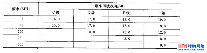 回波損耗只在布線系統中的C、D、E、F級采用,在布線的兩端均應符合回波損耗值的要求,布線系統信道的最小回波損耗值應符合下表所示的規定。