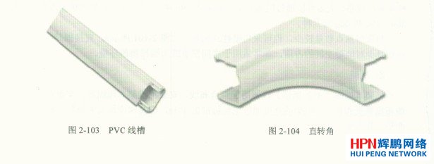 PVC:線槽(如圖2.103所示)的品種規格較多,主要從線槽寬度進行區分。與.PV(:槽配套的附件主要包括陽角、陰角、直轉角(如圖2.104所示)、平三通、左三通、右三通、連接頭、終端頭、接線盒(暗盒、明盒)等。