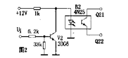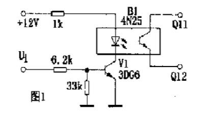 圖1電路中,當輸入信號ui為低電平時,晶體管V1處于截止狀態,光電耦合器B1中發光二極管的電流近似為零,輸出端Q11、Q12間的電阻很大,相當于開關“斷開”;當ui為高電平時,v1導通,B1中發光二極管發光,Q11、Q12間的電阻變小,相當于開關“接通”.該電路因Ui為低電平時,開關不通,故為高電平導通狀態.同理,圖2電路中,因無信號(Ui為低電平)時,開關導通,故為低電平導通狀態.