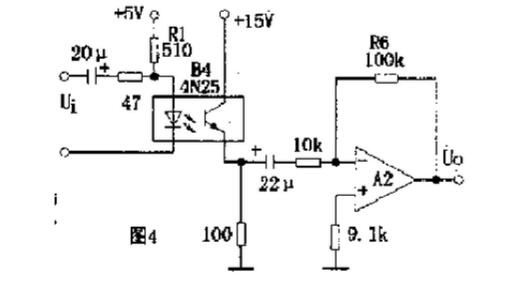 電路如圖4所示.這是一個典型的交流耦合放大電路.適當選取發光回路限流電阻Rl,使B4的電流傳輸比為一常數,即可保證該電路的線性放大作用。