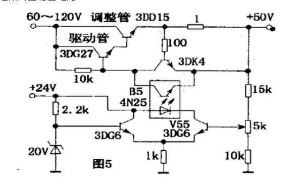 電略如圖5所示.驅動管需采用耐壓較高的晶體管(圖中驅動管為3DG27)。當輸出電壓增大時,V55的偏壓增加,B5中發光二極管的正向電流增大,使光敏管極間電壓減小,調整管be結偏壓降低而內阻增大,使輸出電壓降低,而保持輸出電壓的穩定。