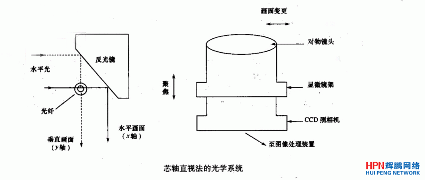 層和空氣之間的明暗圖像,移動顯微鏡可以觀察到光纖的水平及垂直畫面。通過物鏡被