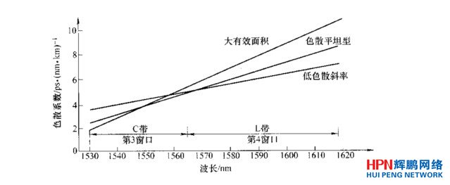 非零色散位移單模光纖的基本設計思想是在1550nm波長區域內具有合理的低色散,足以支持10Gbit/s的長距離傳輸而無需色散補償;同時,其色散值又必須保持非零特性來抑制四波混頻和交叉相位調制等非線性效應的影響,以求同時滿足開通時分復用和密集波分復用系統的需要。為此,人們在研發出了第一代非零色散位移單模光纖的基礎上,又陸續開發出第二代產品,如低色散斜率非零色散位移單模光纖、大有效面積非零色散位移單模光纖和色散平坦型非零色散位移單模光纖。三種G.655光纖色散斜率的比較如圖所示。