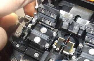 7、光纖熔接:將切好的兩個要熔接的光纖頭放在機器里面,如下圖,開始熔接。如果直接就可以看到光纖截面非常不平整,一定要拿出來重新切一下。