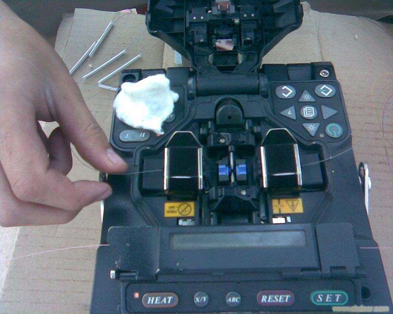 4、制作光纖端面。光纖端面制作的好壞將直接影響接續質量,所以在熔接前一定要做好合格的端面。用專用的剝線鉗剝去涂覆層,再用沾酒精的清潔棉在裸纖上擦拭幾次,用力要適度,然后用精密光纖切割刀切割光纖,對0.25mm(外涂層)光纖,切割長度為8mm-16mm,對0.9mm(外涂層)光纖,切割長度只能是16mm。